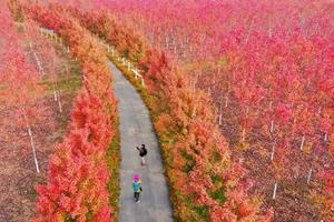 徐州紅楓公園,放眼望去,成片的樹林被紅色覆蓋,這里既有楓樹的火紅,又有椴樹的金黃,40萬株色葉綠化苗木組成了一個絢爛的世外桃源。這么一處新增的網紅景點,真的是讓不少游客流連忘返。